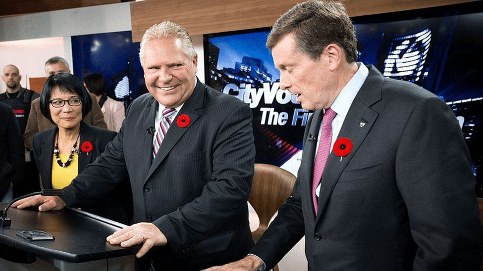 Olivia Chow (left) is no stranger to politics. She ran for mayor in 2014, losing to John Tory (right). Doug Ford (center) also ran, and is now the premier of Ontario
